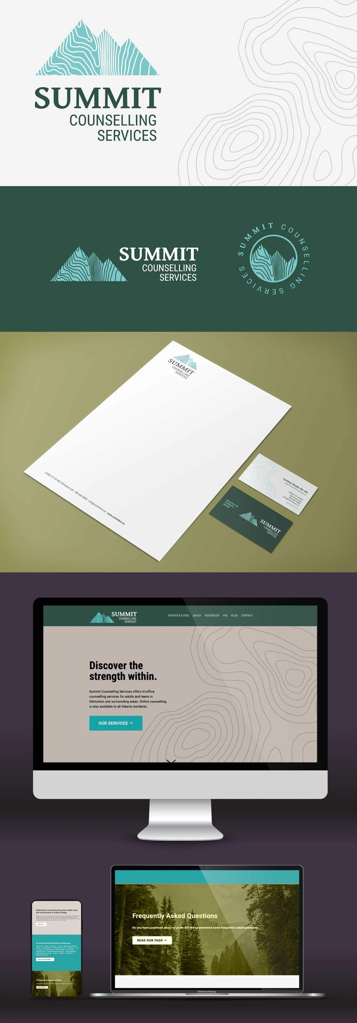 This project included a redesign of the Summit Counselling Services logo and needed to include a reference to mountains and summits. It needed to reflect the welcome and safe space of the practice. The typefaces used are Gentium Book Basic Bold and Roboto Condensed Regular.